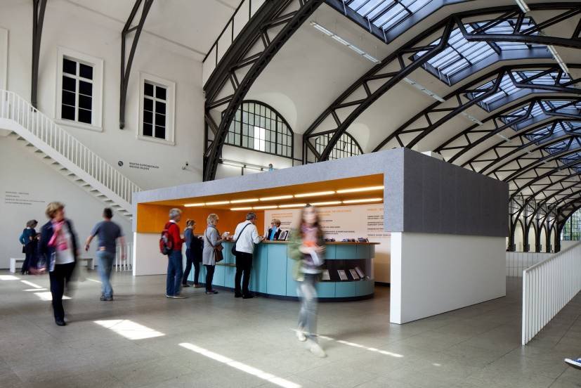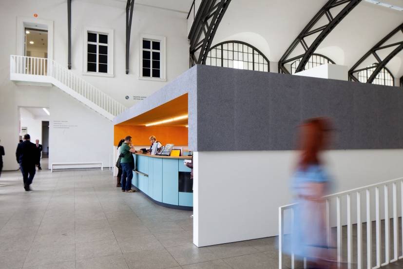 Um den Mitarbeitern des Empfangstresens während der Zeit der Soundinstallation einen Geräuscheschutz zu bieten und ihnen gleichzeitig die Möglichkeit zu geben, sich in normaler Lautstärke mit Besuchern zu unterhalten, wurde ein halboffenener Raum entwickelt, der im oberen Bereich mit Akustikplatten bekleidet ist. Das Objekt ist um bestehende Objekte wie Tresen und Informationswand herumgebaut.