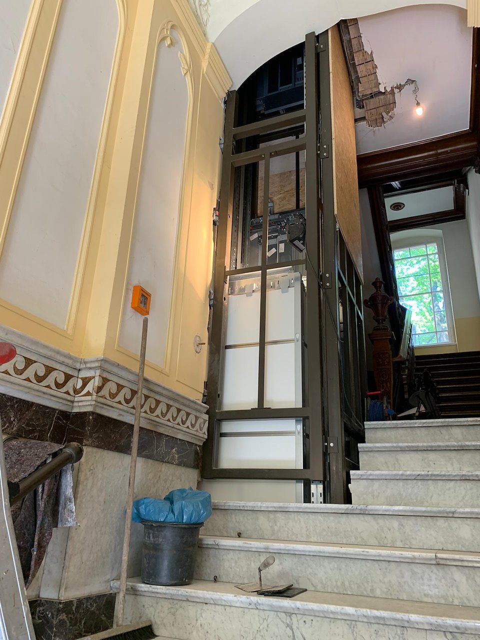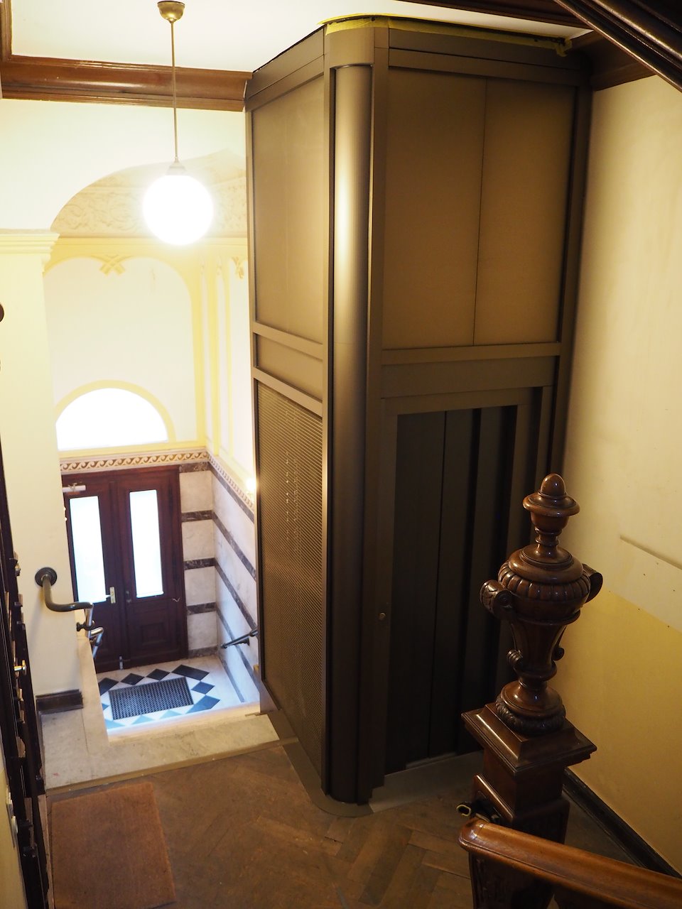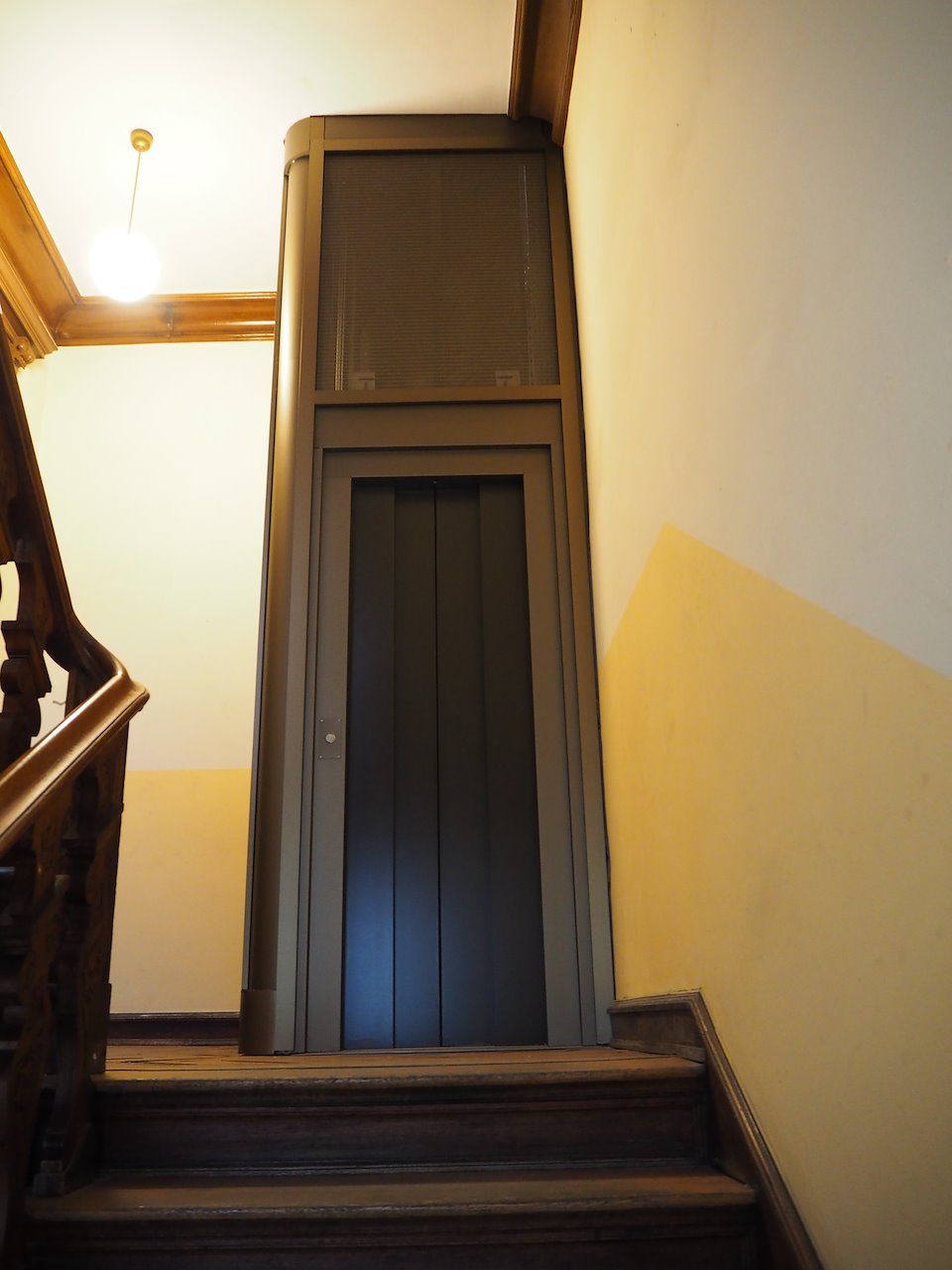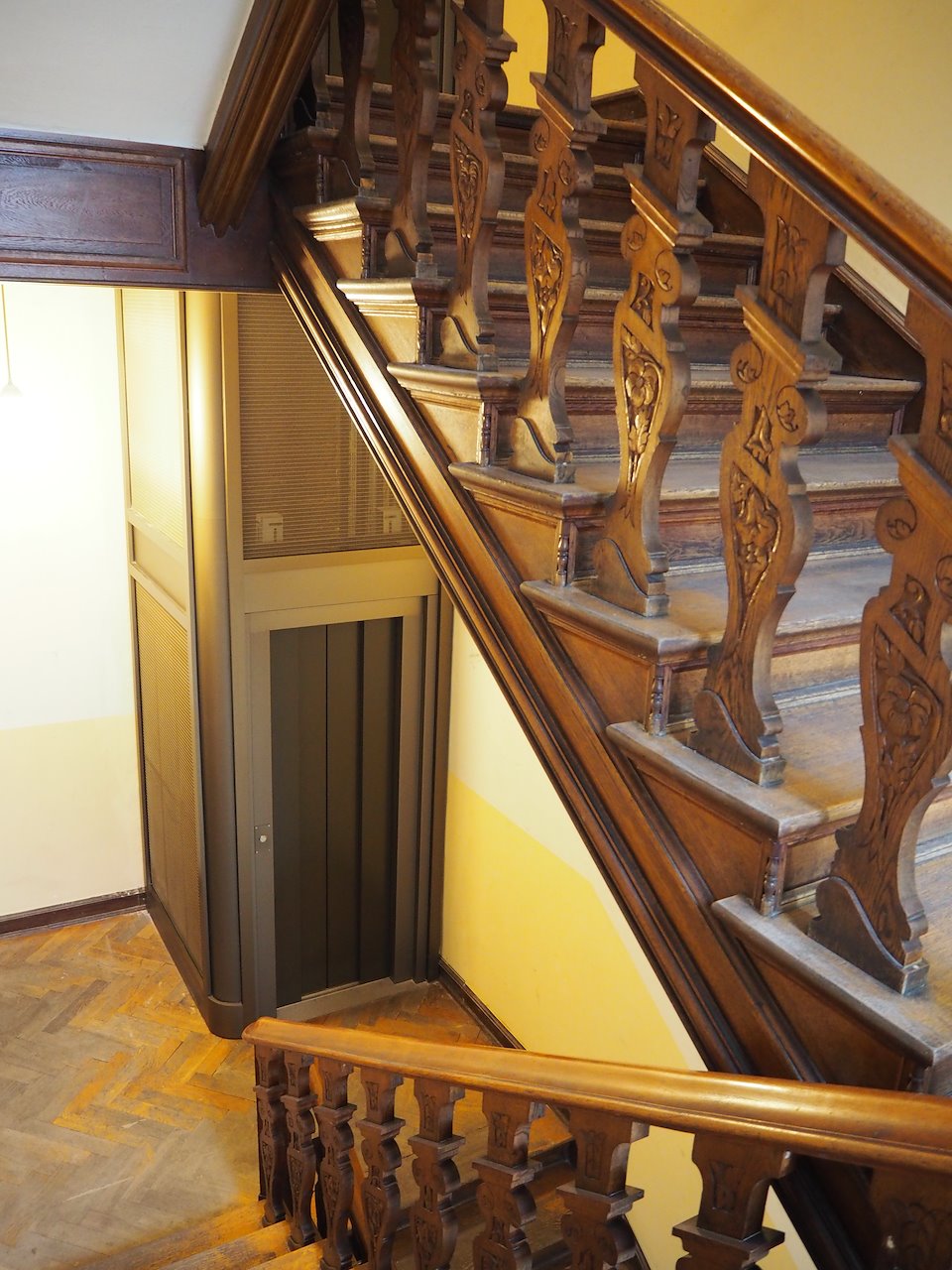 Einbau eines innenliegenden Personenaufzugs in den Treppenraum eines Mehrfamilienhauses aus der Gründerzeit.
