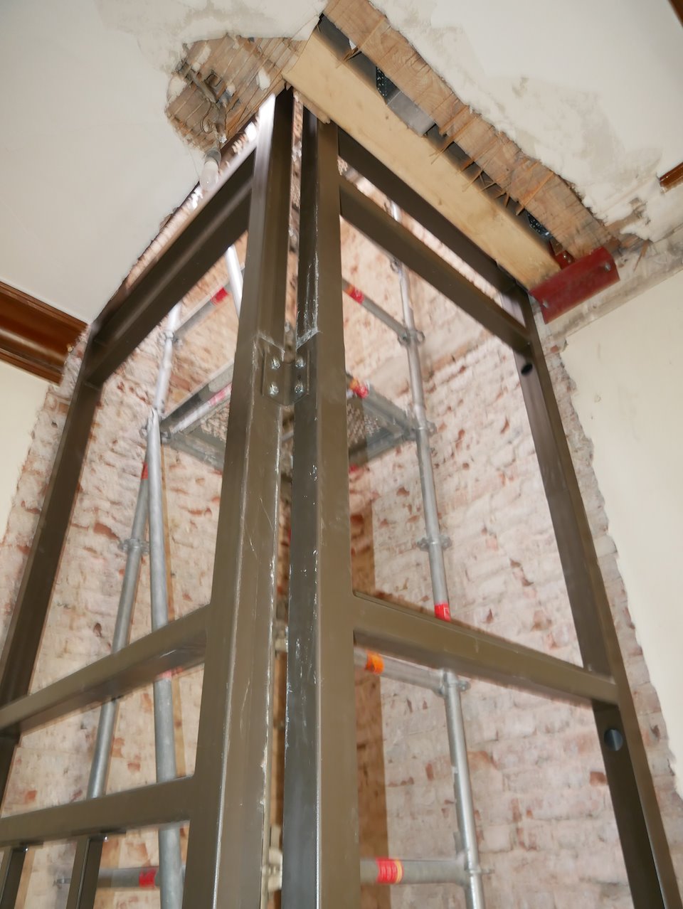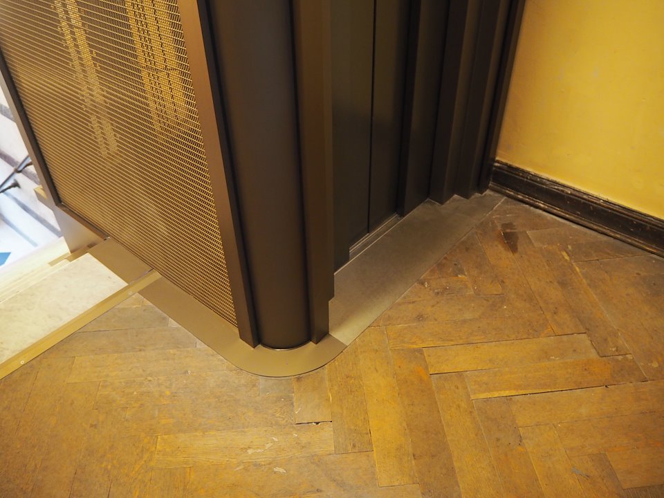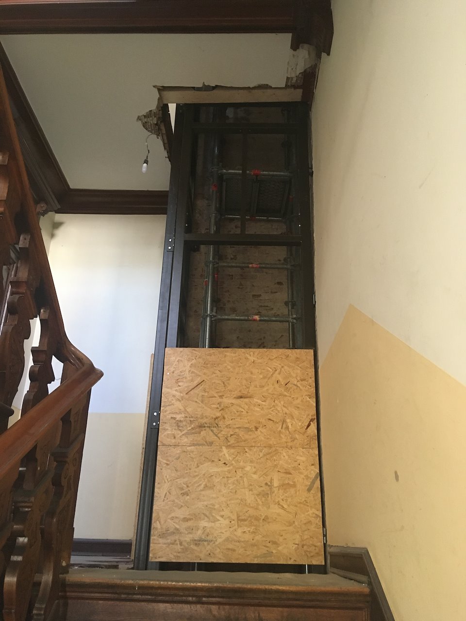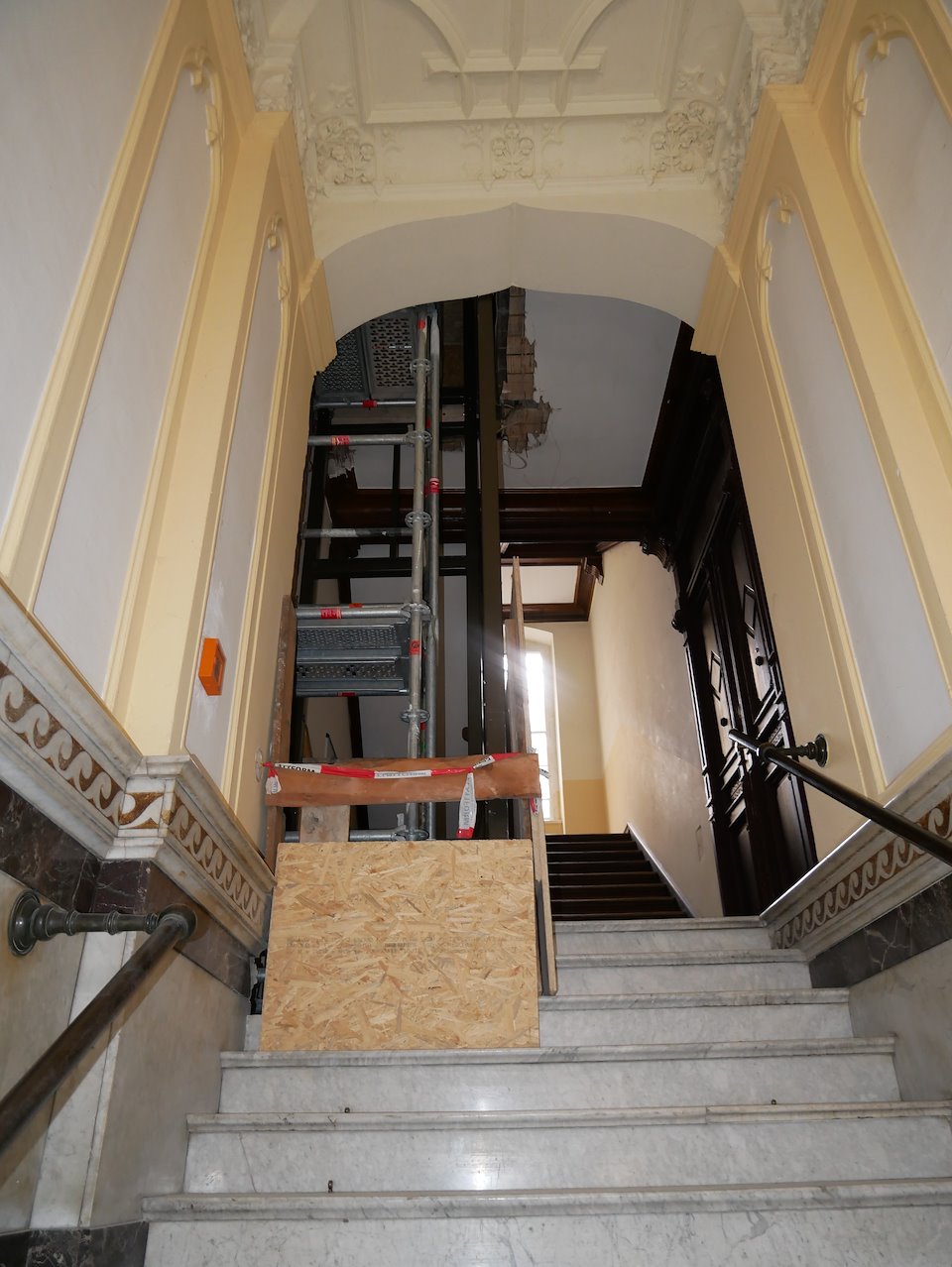Einbau eines innenliegenden Personenaufzugs in den Treppenraum eines Mehrfamilienhauses aus der Gründerzeit.